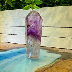 This Brazilian Amethyst Quartz tower carries a saturated violet crown that transitions gradually into icy, translucent quartz near the base. Soft internal veils and subtle zoning drift through the interior, creating layered depth and gentle tonal movement that becomes more pronounced as light passes through the polished faces.