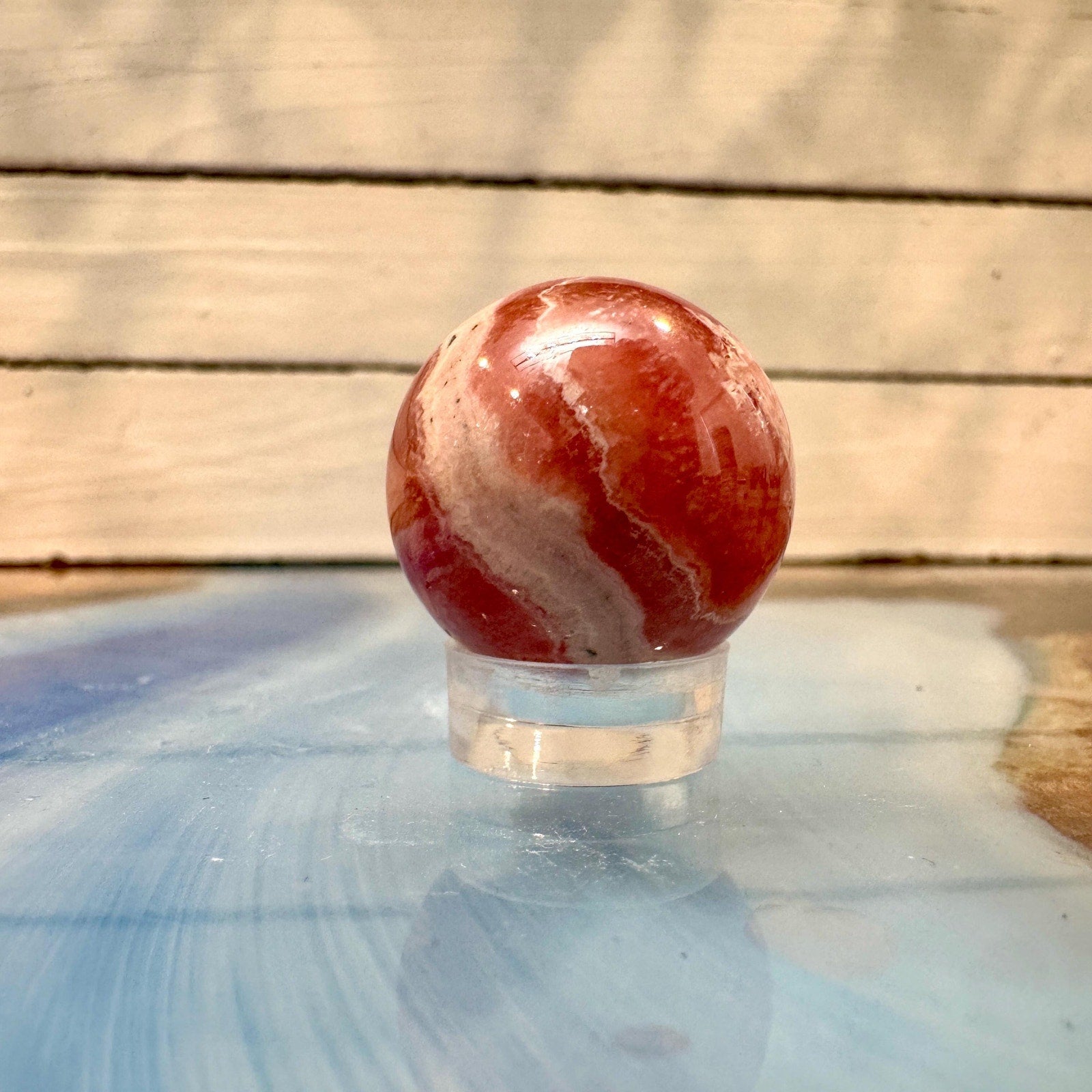 This Rhodochrosite sphere carries a soft rose-pink glow threaded with deep raspberry tones and creamy white ribbon banding that drifts through the stone in slow, painterly layers. The satin-polished surface amplifies its natural warmth, allowing the internal color transitions to flow gently beneath the surface with a calm, luminous presence.