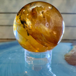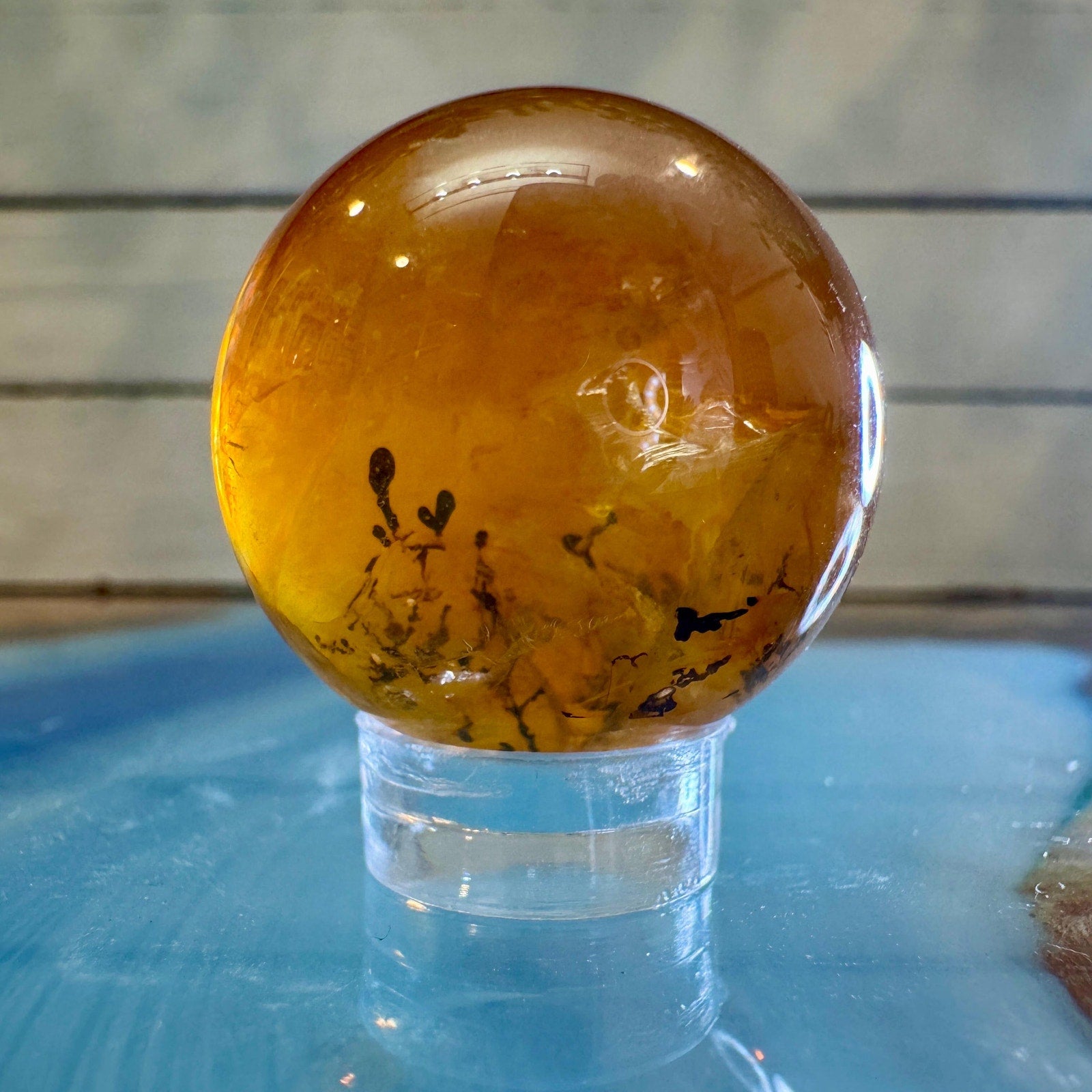 This Golden Healer Dendritic Quartz sphere carries a natural honey-gold translucence intersected by rare dendritic mineral formations that branch through the interior like fine ink-drawn structures. The contrast between warm golden quartz and dark internal dendrites creates clear depth and structural definition that feels both organic and atmospheric.