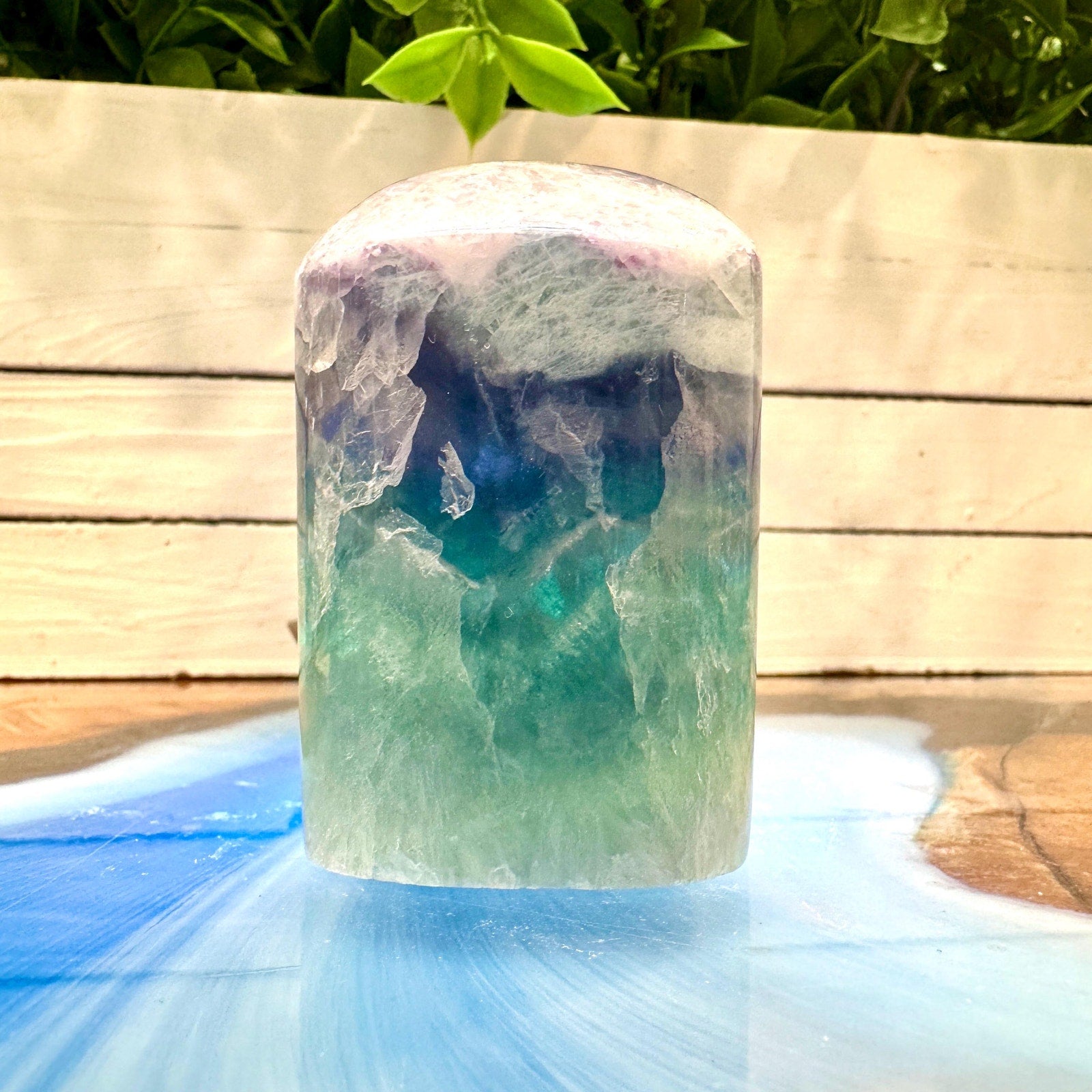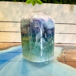 This Feather Fluorite tower presents layered aqua and sea-glass green tones accented by soft lavender zoning that drifts through the crystal in gentle, fluid bands. Intricate feather-like inclusions are suspended within the body of the stone, creating internal movement and visual depth that defines high-quality rainbow fluorite. The polished surface heightens the contrast between clear zones and layered color, giving the tower a luminous, dimensional presence.