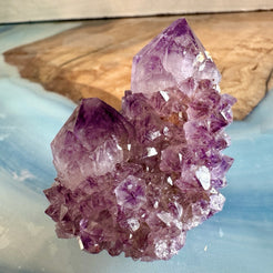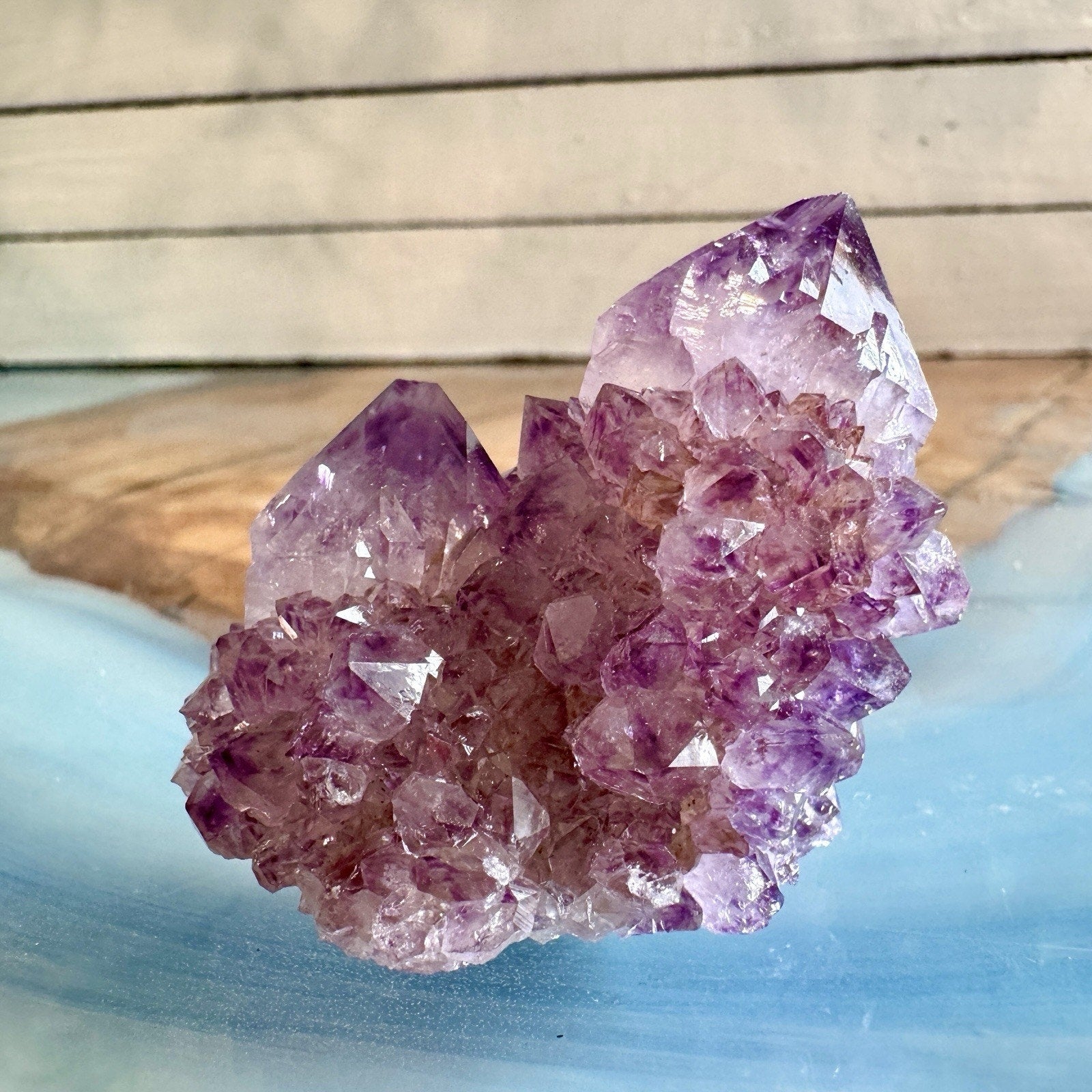 Originating from the Mpumalanga region of South Africa, this specimen showcases the area’s signature color zoning—soft lilac at the base, deepening to rich violet near the crystal tips. The fine druzy coating adds a captivating, glittering texture that enhances its ethereal beauty and natural harmony.