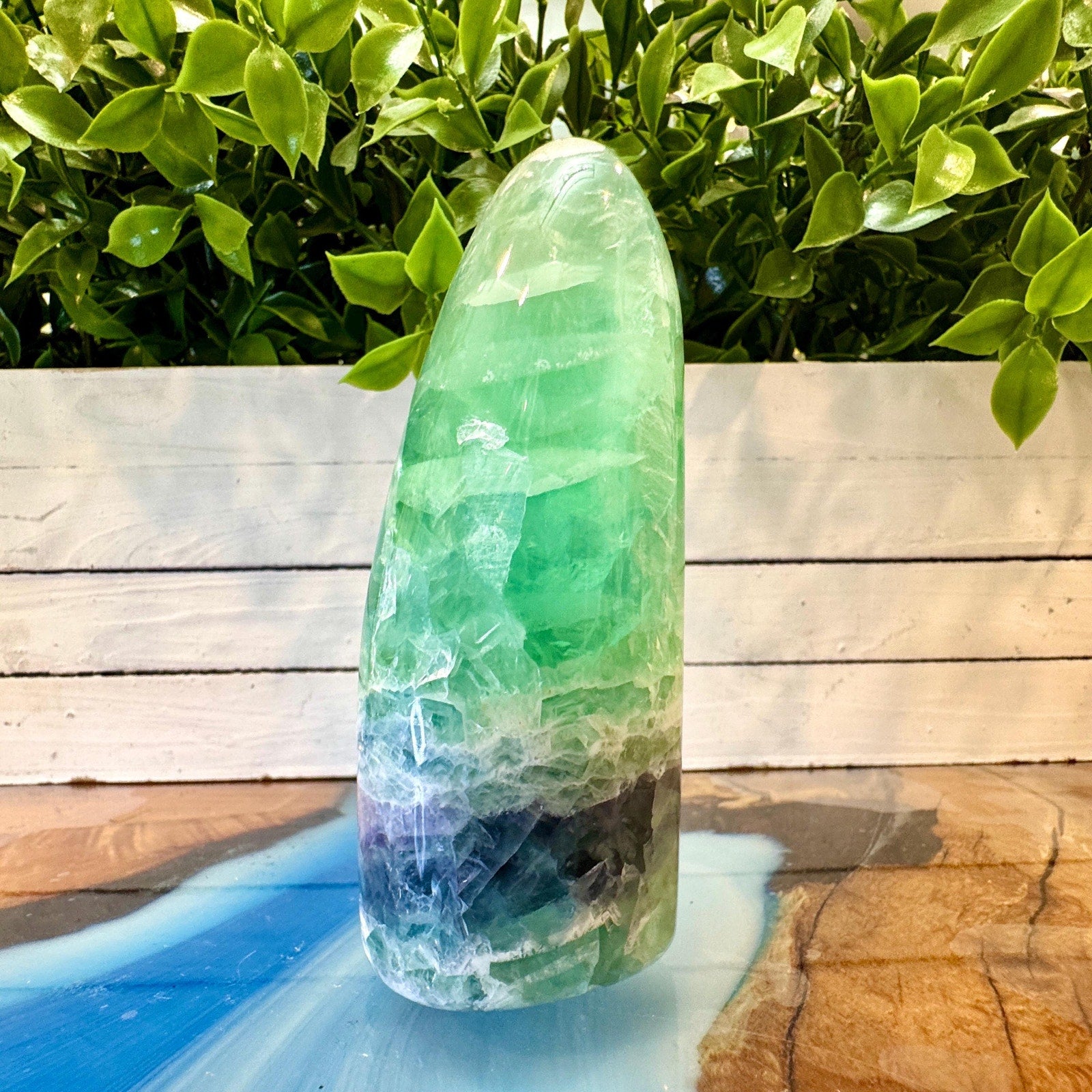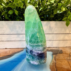 This Feather Fluorite tower carries a soft, atmospheric glow that emerges as you turn it in the light. Layers of aqua and sea-glass green blend with soft lavender zoning, creating a fluid gradient reminiscent of tidal water meeting dusk. Within these bands, feather-like inclusions rise delicately through the crystal—airy, plume-like structures that resemble underwater currents or softly lit aurora strands.