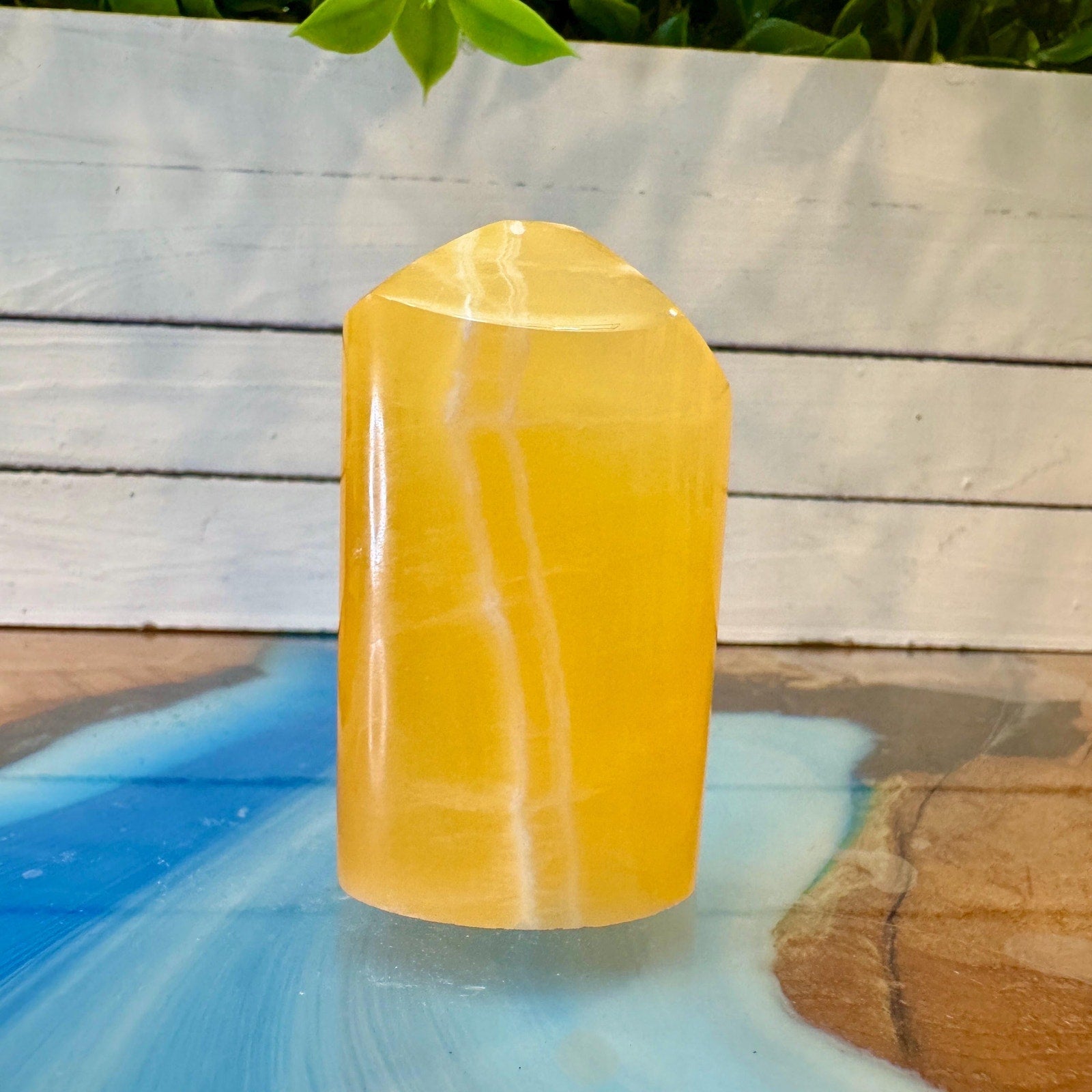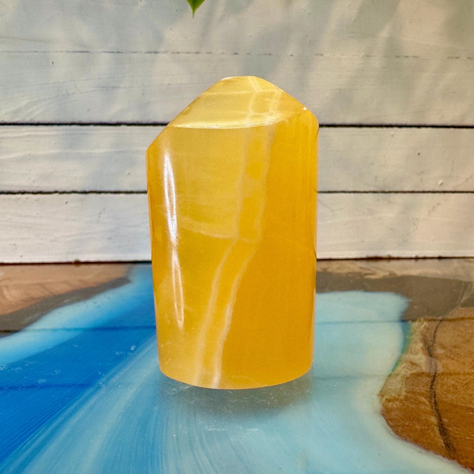 The polished tower form draws the eye upward along its vertical structure, showcasing the banding and inner glow that develop through evaporitic formation. It’s a display-ready piece selected for its warmth, light response, and refined architectural shape.