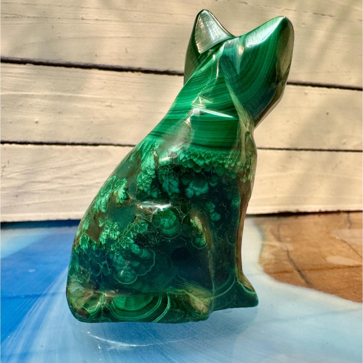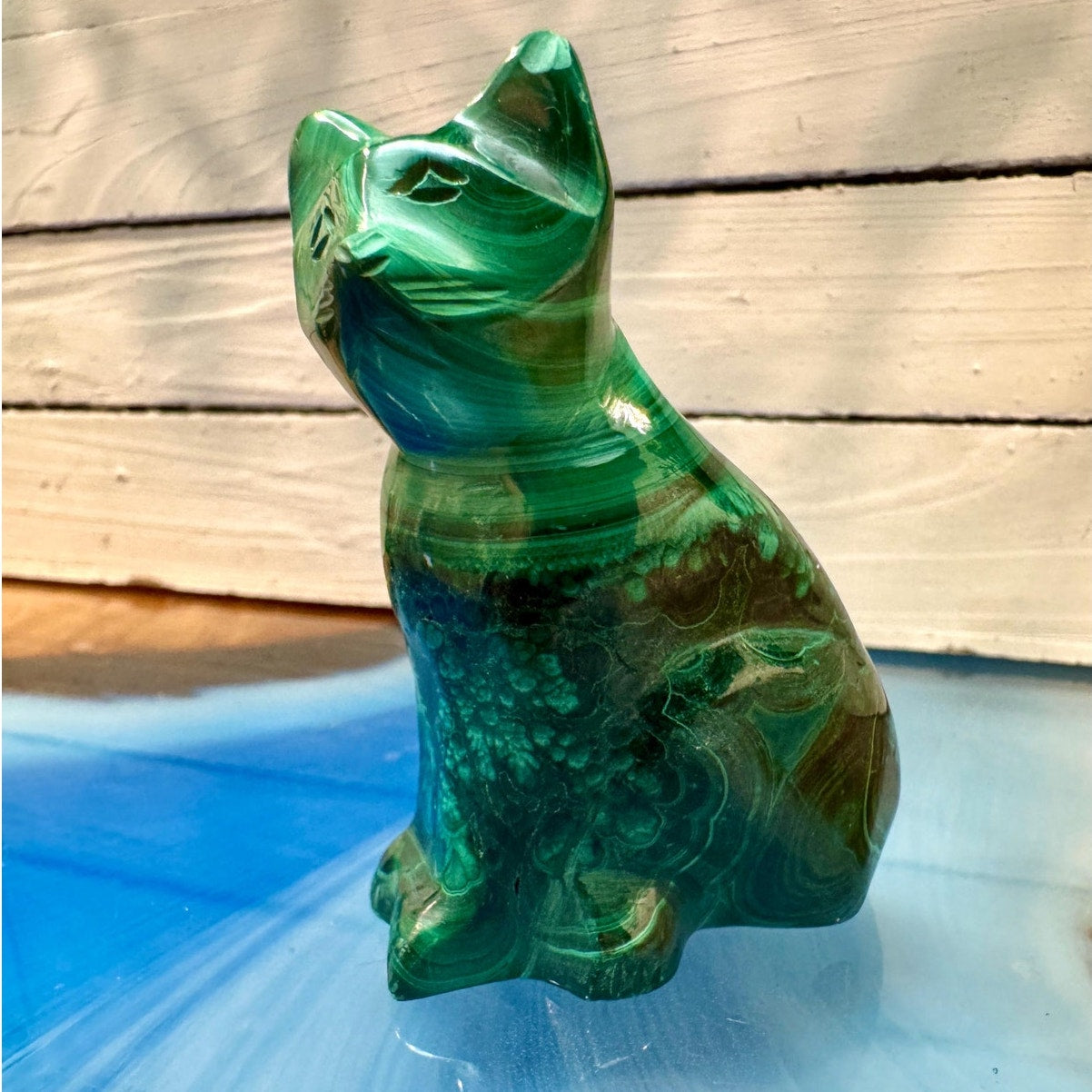 This Malachite cat carving carries the deep emerald and forest-green intensity that defines fine Congolese malachite. Flowing bands of saturated green sweep across the surface like liquid velvet, forming rhythmic curves that feel almost alive beneath the polish. The seated feline shape emerges naturally from the stone, with perked ears, rounded contours, and a poised posture that enhances the mineral’s organic movement.